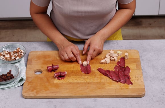 4Saupoudrez d'amandes concassées et de 2 raisins secs puis enroulez sur elles-mêmes les tranches de Magret fumé afin de bien couvrir la farce.