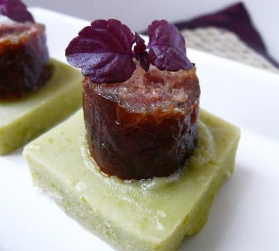 L'agar-agar aide la purée de pois cassés à figer mais une fois en bouche, la bouchée redevient purée et c'est magique...ment bon!