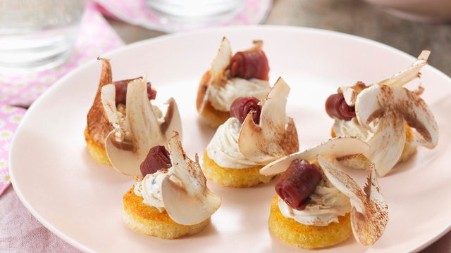 Déposez le Tartare® Noix et Éclats d'Amandes au centre des toasts à l'aide d'une poche à douille, ainsi que quelques lamelles de champignons de Paris et une tranche de magret fumé.