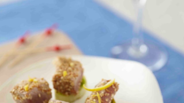 Préparer une marinade avec l'huile de sésame, le cidre, le zeste et le jus de citron, le sésame, le sel et le poivre. Y Plonger le thon coupé en cubes de 2 à 3 cm de côté, et réserver.