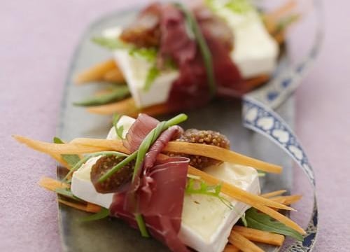 Étalez les tranches de bresaola sur le plan de travail. Déposez un peu de carotte et de roquette dessus puis une tranche de Caprice des Dieux, un morceau de figue et encore un peu de carotte et de roquette.