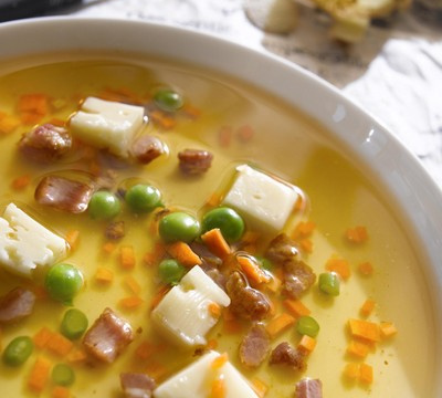 Le Bouillon de pommes de terre à la Tomme de Savoie Fermière est une soupe légère et idéale pour vos soirées d'été. Le goût caractéristique du bouillon en étonnera plus d'un grâce au contraste entre les petits poids et les dés de carottes croquants avec la Tomme Fermière fondue.