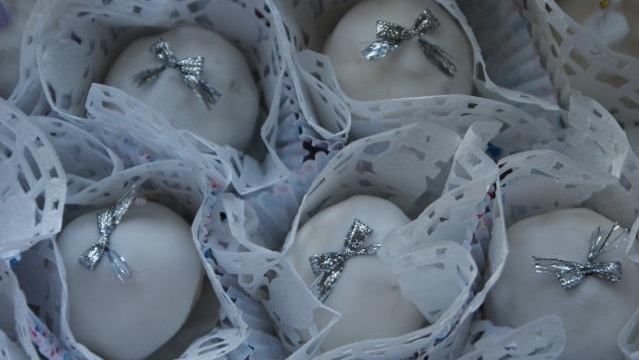 Glacez les gâteaux, décorez de trois perle argentée ou de petits noeuds et laissez sécher à l'air libre toute une nuit. Mettez dans des caissettes. - 4