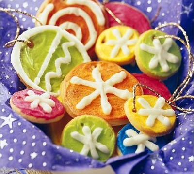 Préparer le glaçage blanc pour décorer les biscuits, tamiser 50g de sucre glace dans une terrine placée au bain-marie. Délayer peu à peu avec une cuillerée à soupe d'eau en remuant, pour obtenir une pâte épaisse, mais coulante. Préparer trois autres glaçages, en utilisant à chaque fois 50g de sucre glace tamisé et 1 cuillerée à soupe d'eau, et en incorporant respectivement quelques gouttes de colorant rouge, bleu ou vert.