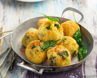 Hachez fin le blanc. Mélangez la purée, le fromage, le blanc haché et l'oignon. Laissez refroidir. Mettez un morceau de purée dans le creux de la main. Creusez un nid. Mettez dedans le jaune d'œuf. Fermez en boulette.