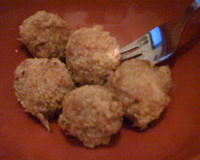 Former des boulettes avec la farce (2-3 cm de diamètre), les plonger dans l'oeuf puis dans la semoule.