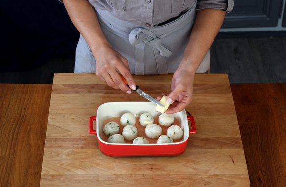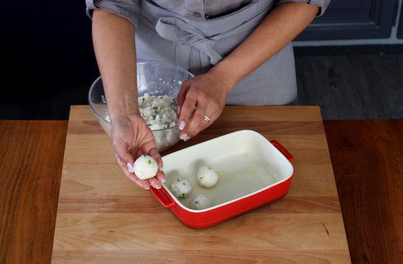 5Confectionnez des boulettes de la taille d'une grosse noix, déposez-les dans un plat à gratin.