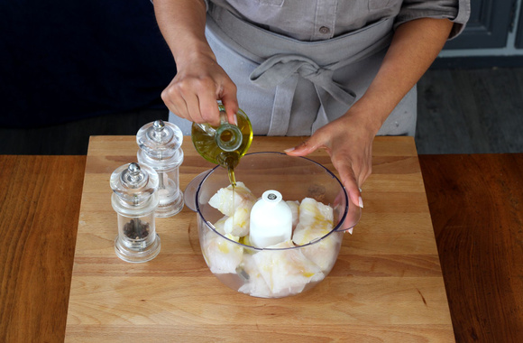1Coupez les dos de cabillaud en gros morceaux puis mettez-les dans le bol d'un blender.