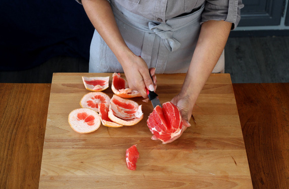 9Pelez à vif les 2 pamplemousses restants. Les coupez en quartiers. Puis les faire revenir dans une poêle avec 1 morceau de beurre, salez, poivrez et réservez.