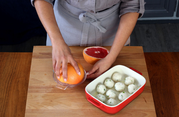 7Arrosez les boulettes de cabillaud avec le jus de pamplemousse. Salez et poivrez.