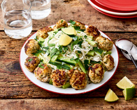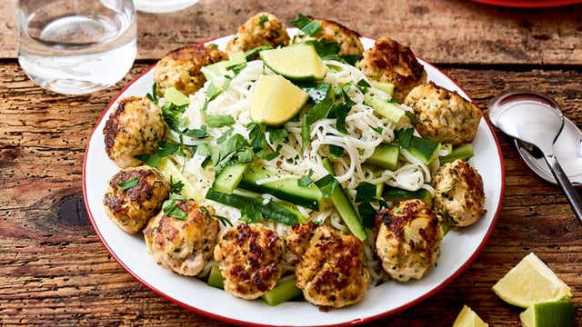 Servir les boulettes avec les nouilles de riz, arrosées d’un filet d’huile d’olive, les bâtonnets de concombre et les citrons coupés en quartiers. Rectifier l’assaisonnement.