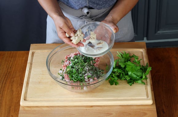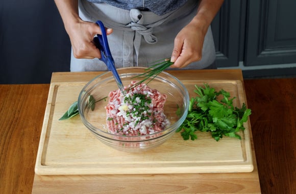 5Mettez-les dans un grand saladier avec les viandes hachées, ajoutez la sauge, le persil et la ciboulette ciselés.