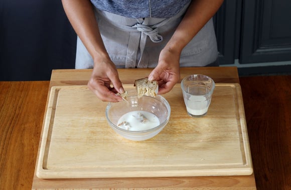 3Coupez la tranche de pain rassis en petits dés et faites-les tremper dans le lait.