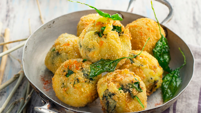 Former des boulettes avec les pommes de terre écrasées en enfermant au centre 1 c à c de crème épinard.