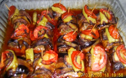 D'autre part, lavez les aubergines, coupez en lanières en longueur, mettez une boulette Dans chaque lanière et roulez ensemble, ficelez - le. - 2