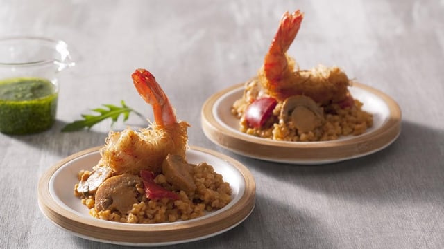 Dresser le boulgour aux champignons en assiette creuse, disposer les gambas dessus, puis ajouter un trait de pesto.