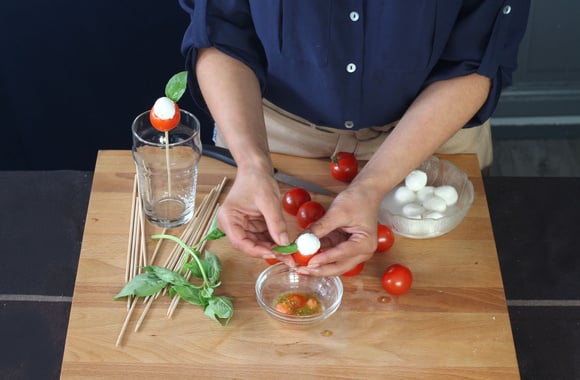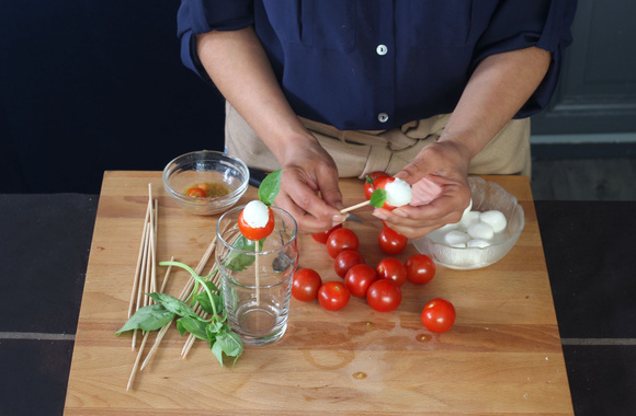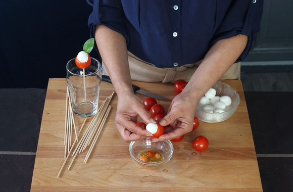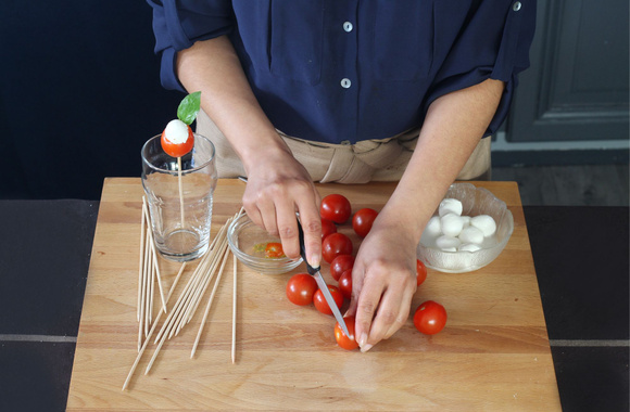 5Piquez chaque tomate cerise farcie d'un bâtonnet. Servez pour l'apéritif.