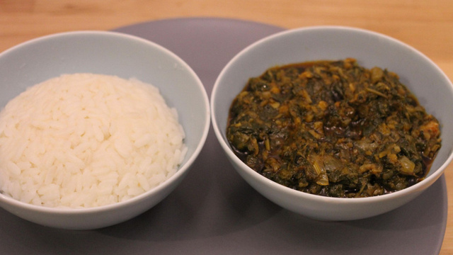 Le plat traditionnel de Guinée avec son riz à la sauce feuilles de lalo. Une recette authentique de Madame Fofana pour les ateliers de cuisine du monde Kialatok.