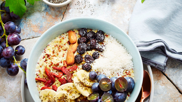 Rincez le raisin. Découpez des rondelles de bananes. Répartissez le quinoa-coco dans un grand bol, parsemez de coco râpée, des rondelles de bananes de graines de chia, des baies de goji, des cranberries, des amandes et ajoutez les grains de Muscat du Ventoux à volonté.