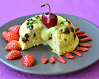 Faire cuire 4 minutes au micro-ondes puis retourner sur une assiette. Déposer les carrés de chocolat blanc au centre et servir avec la cerise sur le dessus, quelques pistaches concassées, fraises et baies de goji.