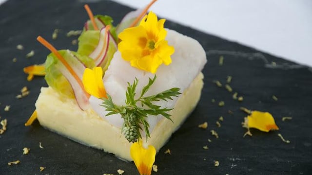 Dressez un carré de cabillaud sur un lit de brandade et plantez des légumes crus ou cuits de saison qui apporteront couleur et craquant.