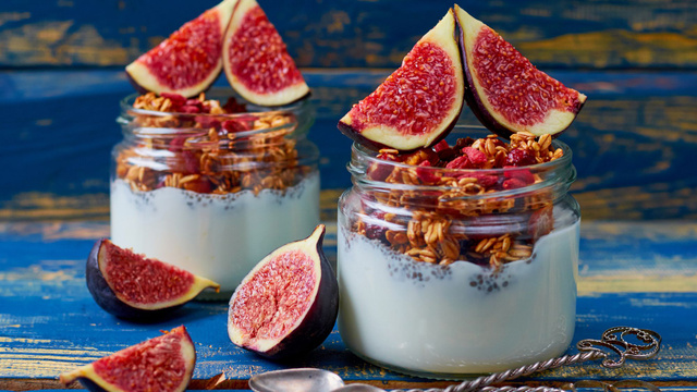 Répartissez le mélange aux graines de chia dans 4 bols, ajoutez un peu de granola puis les figues lavées et coupées en deux.