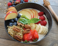 Au moment de servir, ajouter le yaourt grec, l'étaler et disposer les fruits, les noix et le granola de façon esthétique.