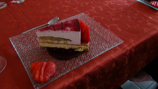 La douceur la gariguette, une touche d'acidité avec la rhubarbe le tout sur un croustillant sablé breton.