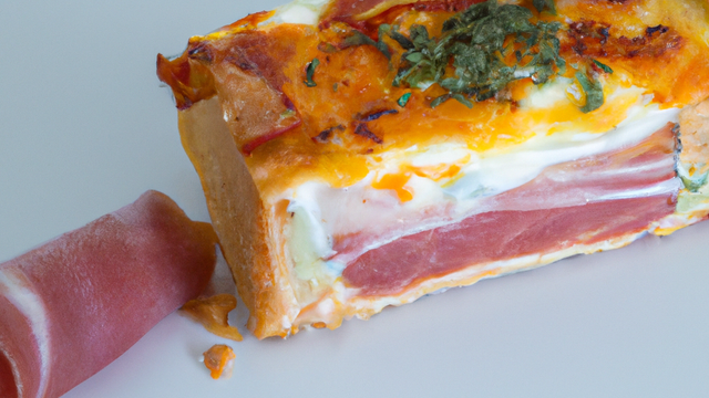 Jambon accompagné d'une sauce roquefort, sur un lit de poire, enroulé dans une feuille de brick croquante.