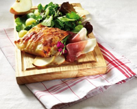 Disposez les bricks sur un lit de salade, accompagnées de billes de Pommes de Savoie et d'une tranche de Jambon de Savoie.