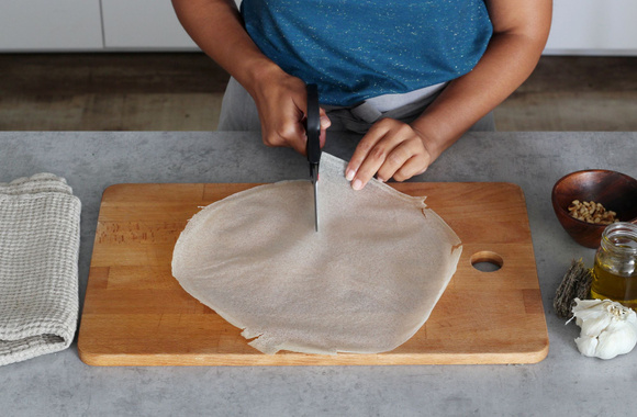 5Coupez en deux les feuilles de brick à l'aide d'un ciseau.