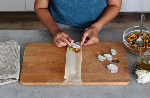 6Prenez une demi-feuille de brick, disposez-la sur le plan de travail dans le sens de la longueur. Rabattez le côté arrondi vers le centre pour obtenir une bande rectangulaire.