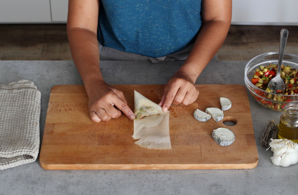 8Repliez sur elle-même l'extrémité de la feuille de brick avec la farce pour former un triangle, en veillant à bien enfermer la farce.