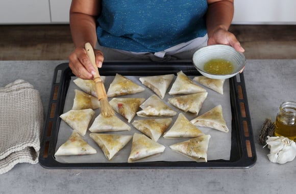 10Préchauffez le four à 200°C. Disposez les bricks sur une plaque recouverte de papier sulfurisé. Badigeonnez-les de beurre fondu.