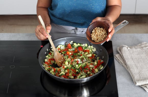 Ajoutez les pignons de pin, mélangez. Ôtez du feu et laissez tiédir.