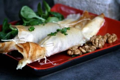 Étalez les feuilles de brick, et garnissez-les de tranches de reblochon, de noix concassées, de ciboulette ciselée, de sel et de poivre.