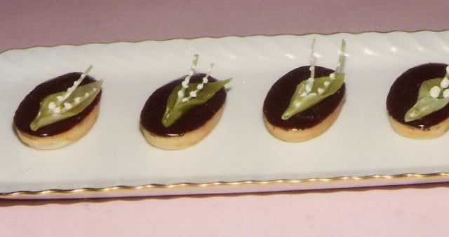 Faire fondre doucement le chocolat avec la crème fraîche en remuant - bouillir - ajouter le beurre - remuer de temps en temps jusqu'à température (35 - 40° environ) - régler la consistance avec du sirop - tremper la surface de chaque pièce dans le chocolat - essuyer les bords avec le doigt - poser un brin de muguet.