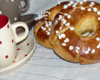 Dégazer la pâte et puis étaler-la au rouleau sur épaisseur 2cm et à l'aide d'un emporte pièce rond de 9cm de diamètre découper des ronds faire un trou au milieu et à l'aide d'un ciseau faites des incisions tout au tour comme sur l'image ,laisser lever pendant 20min et puis passer de la dorure par dessus à l'aise d'un pinceau et enfourner dans un four chaud à 200°C pendant au moins 30min.