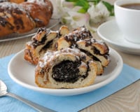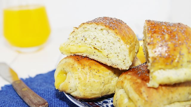 Dorer le dessus de brioches d'un œuf battu et saupoudrer de graines de pavot puis mettre au four préchauffé à 180°C pendant 25 minutes.