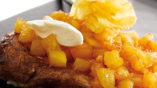 l'ananas caramélisé dessus. Ajouter une petite cuillère de crème épaisse, qui