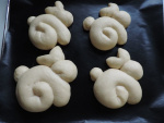2Dégazer la pâte et former les lapinous: un long boudin pour le corps, une petite boule pour la queue, une autre pour les oreilles (couper presque en deux avec un couteau) et une boule un peu plus grosse pour la tête. Utiliser une pépite de chocolat pour l'oeil. Laisser pousser dans un endroit chaud pour que les lapinous doublent de volume.