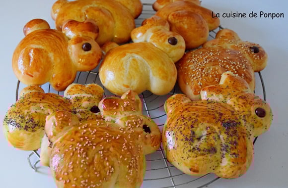 Le temps sera bientôt là où le lapin distribuera les oeufs de Pâques colorés ou des oeufs en chocolat. "L'origine du lapin viendrait d'une légende allemande dans laquelle une femme pauvre, ne pouvant offrir de douceurs à ses enfants, décora des œufs qu'elle cacha dans le jardin. Les enfants, apercevant un lapin, crurent que celui-ci avait pondu les œufs." (Source Wikipédia) J'aime beaucoup cette histoire qui me rappelle la chasse aux oeufs de mes enfants le jour de Pâques. Et pour le dimanche de Pâques, ou même avant!, quoi de mieux que des petits lapinous en brioche?