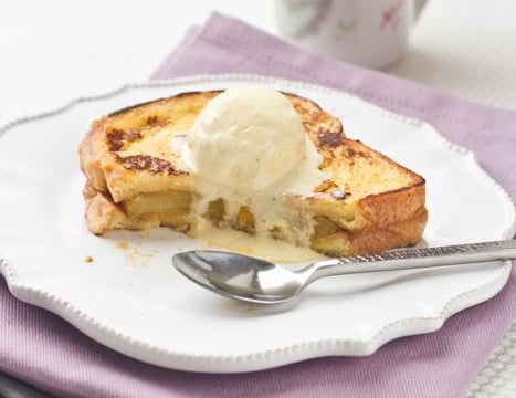 Battez les oeufs entier avec les sucres et les épices puis ajoutez le lait petit à petit en continuant de battre. Trempez les tranches de brioche dans le mélange puis faites les revenir dans une noisette de beurre à la poêle bien chaude. Lorsque les brioches commencent à bien caraméliser déposez une tranche d'ananas sur 4 tranches et recouvrez d'une autre tranche. Finissez de cuire en retournant puis servez accompagné d'une boule de glace vanille.