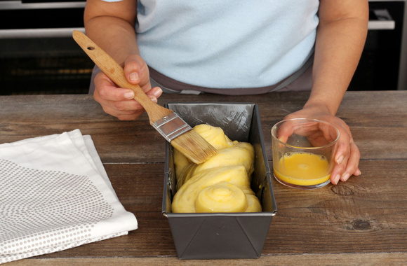 12Préchauffez le four à 180°C. Badigeonnez la brioche avec un œuf battu. Faites cuire au four pendant 30 minutes en surveillant la cuisson.