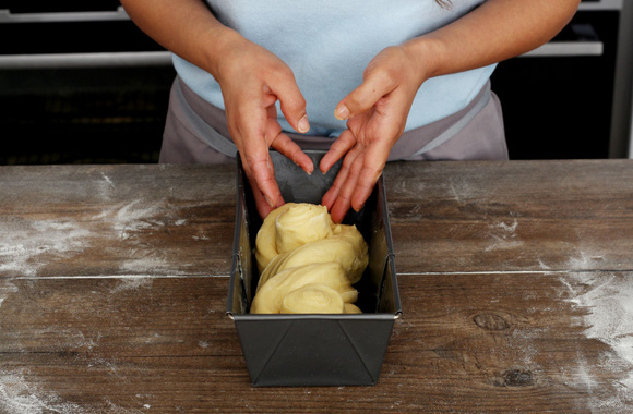 11Beurrez un moule à cake de 28 cm puis déposez la pâte tressée dedans. Laissez pousser 1 heure dans un endroit tiède.