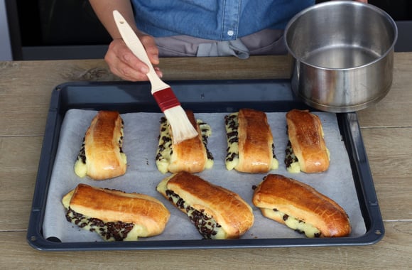 11Une fois cuites, sortez les brioches du four, puis à l’aide d’un pinceau badigeonnez-les de sirop.