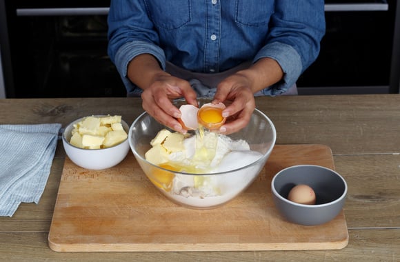 Ajoutez le sucre, le sucre vanillé, le sel, les œufs et le beurre coupé en dés.