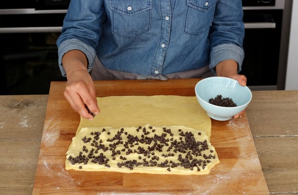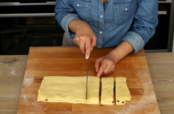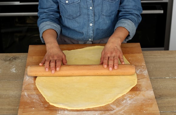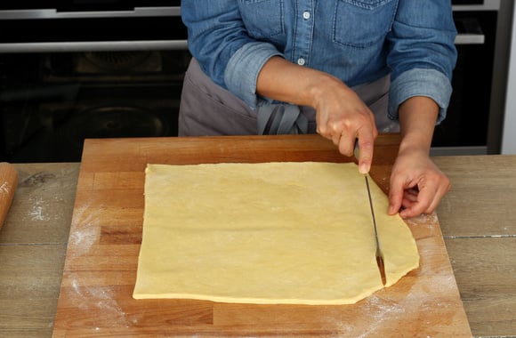 Après le temps de pause de la pâte, farinez généreusement le plan de travail. Étalez la pâte sur 5 mm d’épaisseur en forme de rectangle, à l'aide d'un rouleau.