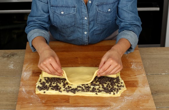 8Rabattez la partie de la pâte sans crème sur la partie garnie. Donnez un léger coup délicat de rouleau.