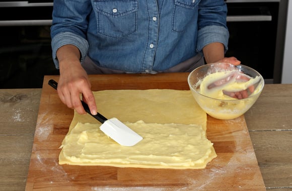 6Badigeonnez la moitié inférieure du rectangle de pâte avec la crème pâtissière.